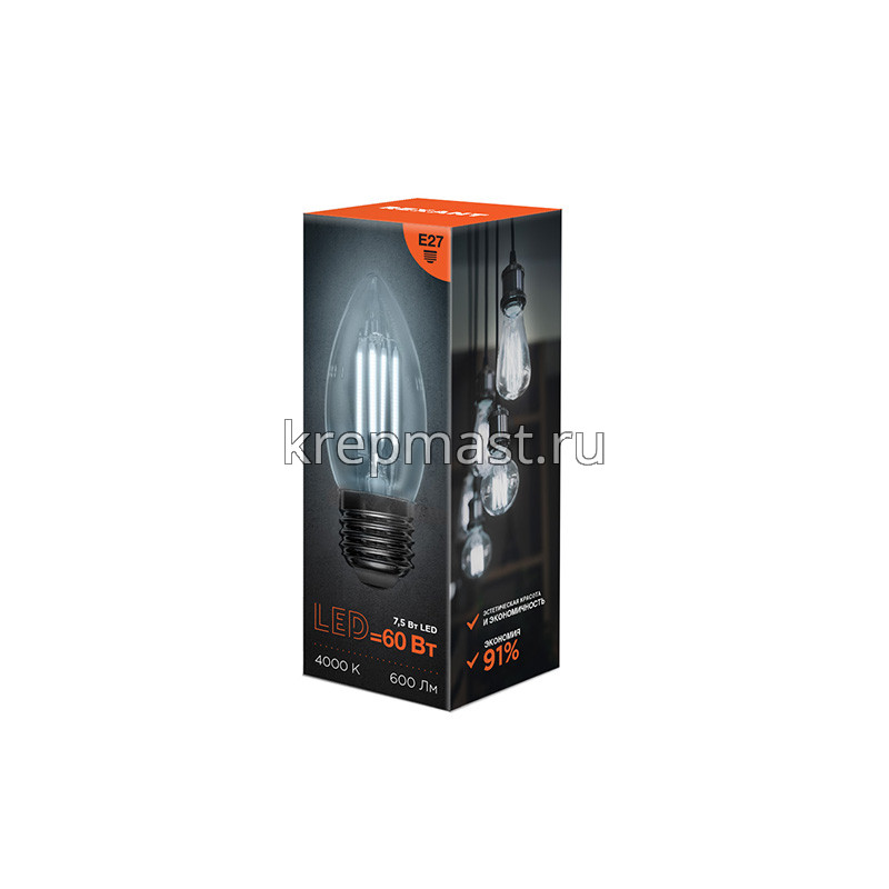 Лампа свеча 7,5Вт Е27 4000K в интернет-магазине «Мастер Крепежа» по цене 122 руб. Более 12 наименований товаров в наличии в категории Лампы светодиод. СВЕЧА. Купить лампа свеча 7,5вт е27 4000k в Йошкар-Оле выгодно Вы можете on-line на нашем сайте, или отправив заявку по почте, а также по телефону или в пункте выдачи компании г. Казань, ул. Татарстан, 9, магазин "Мастер Крепежа". Доставка по Республике Татарстан и другие регионы РФ.