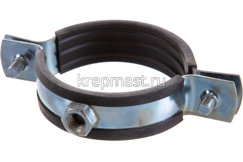 Хомут сантехнический с гайкой М8 60-64 мм представляет собой две металлические пластины, соединенные по краям регулировочными винтами м6 и резиновым уплотнителем. К хомуту приварена гайка м6 с метрической резьбой. Диаметр обжима трубы составляет от 60 до 64 мм. Изготавливается из оцинкованной стали толщиной 1.2 мм.
