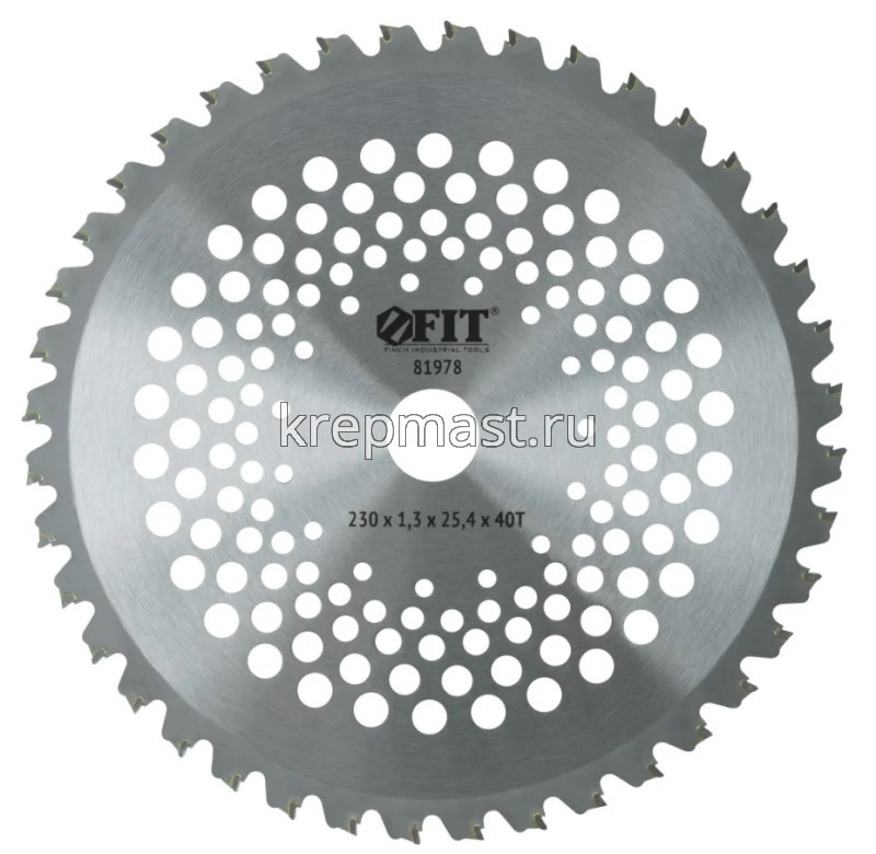 Диск для триммера FIT твердосплав. 230х40Тх25,4мм - предназначен для скашивания зеленой и сухой травы, мелкого кустарника, а также молодой поросли деревьев при совместном использовании с триммером. Специальная форма зуба уменьшает вероятность повреждения ножа при ударе о твёрдые предметы во время работы. Каждый зуб снабжен твердосплавной вставкой для повышения износостойкости и продолжительного срока службы. Наличие перфорации облегчает вес, за счёт чего снижается уровень вибрации и продлевается рабочий ресурс триммера.
