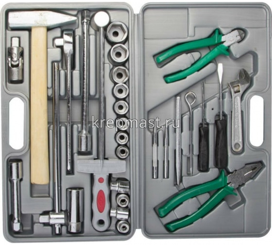 Комплектация | Головки торцовые, 12 шт.: 8, 10, 11, 12, 13, 14, 15, 17, 19, 22, 24, 27 мм. Головка свечная 21 мм Удлинители, 2 шт.: 125, 250 мм Вороток Т-образный Шарнир карданный Плоскогубцы 200 мм Кусачки 160 мм Ключ разводной 150 мм, размер под ключ до 19 мм Зубило плоское 16х160 мм Кернер 3,2 мм Бородок 2 мм Чертилка Отвертки плоские, 2 шт.: 0,6х4,0; 1,0х6,0 мм Молоток - 400 г Ключ динамометрический шкальный КМШ 140 - 1/2" - 20-110 Нм Пластиковый кейс |