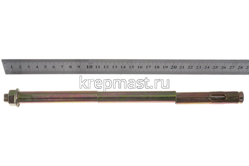 Анкер с гайкой 16 х 300 изготовлен из высокоуглеродистой стали со специальным цинковым покрытием и применяется для надежного крепления тяжеловесных конструкций к твердым основаниям из полнотелых материалов.