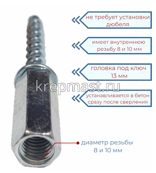 Анкер - шуруп PNB по бетону 6 х 55 (вн.диам.м8/10мм удлин.гайка) не требует установки дюббеля. Его можно закручивать сразу после засверливания. Снабжён дополнительным антикоррозионным покрытием