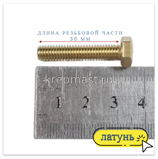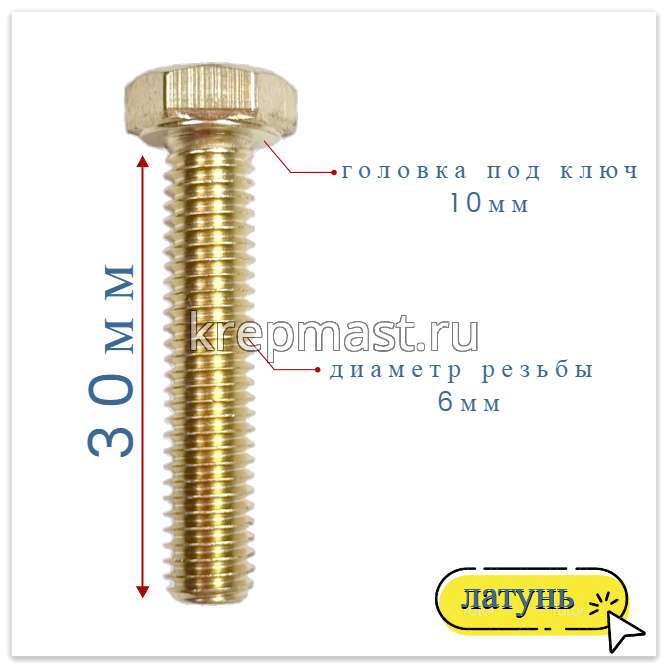 Болт 6х30 DIN 933 латунь в интернет-магазине «Мастер Крепежа» по цене 61 руб. Более 26 наименований товаров в наличии в категории Болты латунные DIN 933. Купить болт 6х30 din 933 латунь в Йошкар-Оле выгодно Вы можете on-line на нашем сайте, или отправив заявку по почте, а также по телефону или в пункте выдачи компании г. Казань, ул. Татарстан, 9, магазин "Мастер Крепежа". Доставка по Республике Татарстан и другие регионы РФ.