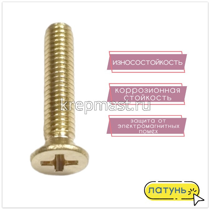 Винт латунный с полукруглой головкой DIN 965 М 4 х 20 используется в случае, когда необходимо создать немагнитный узел. Латунный винт применяется в приборостроении, авиации, атомной промышленности. Латунный крепеж стоек к органическим кислотам и углекислым растворам.