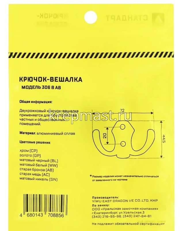 Крючок 306 В WW матовый белый СТАНДАРТ в интернет-магазине «Мастер Крепежа» по цене 120 руб. Более 12 наименований товаров в наличии в категории Крючок-вешалка. Купить крючок 306 в ww матовый белый стандарт в Йошкар-Оле выгодно Вы можете on-line на нашем сайте, или отправив заявку по почте, а также по телефону или в пункте выдачи компании г. Казань, ул. Татарстан, 9, магазин "Мастер Крепежа". Доставка по Республике Татарстан и другие регионы РФ.