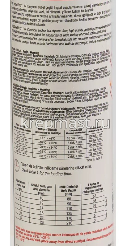 | Применение продукта | крепление тяжеловес. элементов к тверд. камню и бетону, крепл. анкерных,армат. стержней, шурупов |
