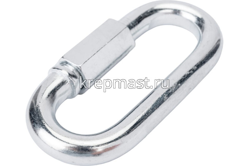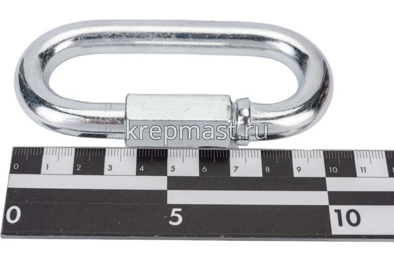 Соединитель цепей с гайкой 12 х 81,0 (карабин винтовой) - cтальной карабин "звено цепи" с винтовой муфтой (фиксатором) применяется для быстрого и надежного крепления тросов и цепей между собой или к чему-либо. Размер карабина определяется по диаметру поперечного сечения проволоки (прутка) и составляет 12 мм.